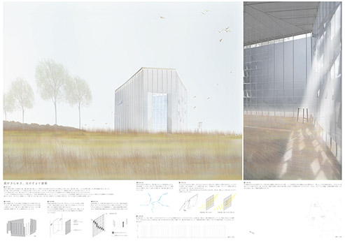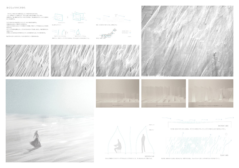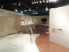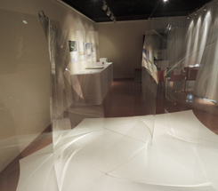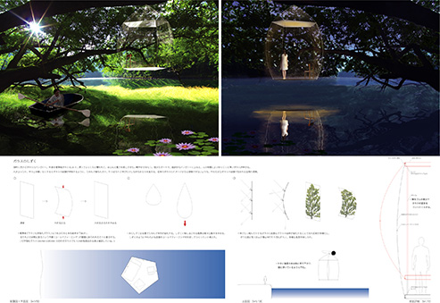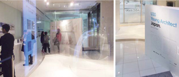岩瀬:私は光に対する扱いづらさが、今回の提案で一番感じたことです。ガラスってこう、感覚的には境界面として使われるので、外が明るいか、内が明るいかで全く表情が違ってきます。それって感覚的には分かるんですけど、今回のような、うねうねさせたガラスをやった時にちょっとその感覚が自分でとらえられないようなところに反射が出てきました。外の光が普段は暗いのに、サイネージが入り込んできて環境が変わったりしました。あと、東京展では自然光が半分だけ入ってくる室内環境で自分が置いたスポットと共存する形になったので、日中のあるタイミングでスポットが効くようになる。それまでは自然光が入ってくるけど、直接光が入ってこなくて間接光が入ってくるみたいな感じで非常に光の環境が変化をしたので、その時々で全然表情が違ったんですね。この時間帯は全くガラスが見えない。この時には人に見てもらいたくないなとか。うまく光が落ちない時があったり、それは私が逆に結構いいなと思った瞬間でもあるんですけど、人は一回しか来てくれないのにベストな状態を見せたいという気持ちもあったりして、そういう意味で本当に不思議で、よくわからないけど面白い部分に興味を持っています。 |